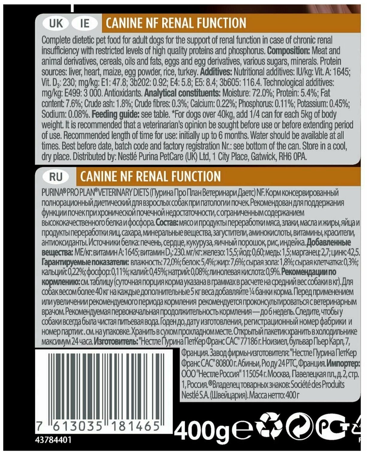 Корм PRO PLAN Veterinary diets NF Renal Function для собак при патологии почек, 400 г x 6 шт интересное: