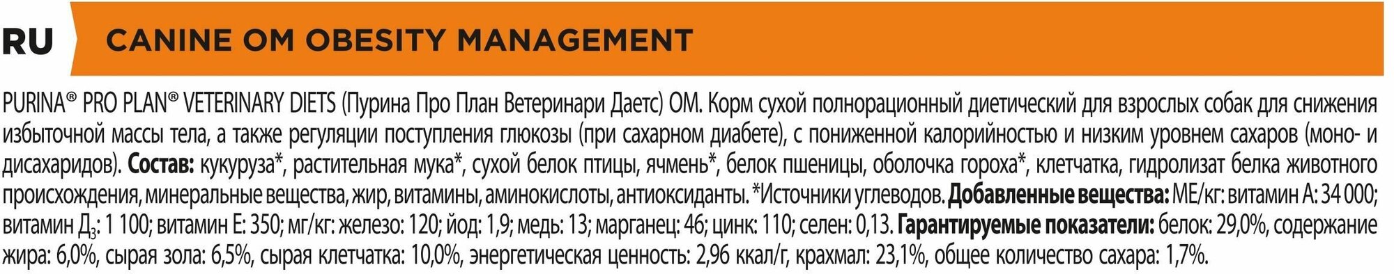 Сухой корм PRO PLAN Veterinary Diets OM Obesity Management для взрослых собак при ожирении, 3 кг, 2 шт