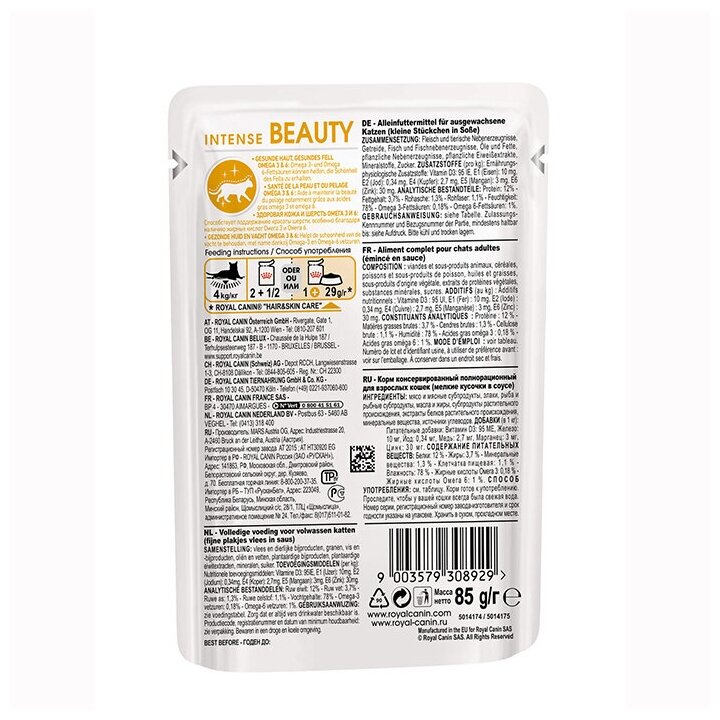 Влажный корм Intense Beauty для кошек, для кожи и шерсти, в соусе, пауч, 85 г, 24 шт.