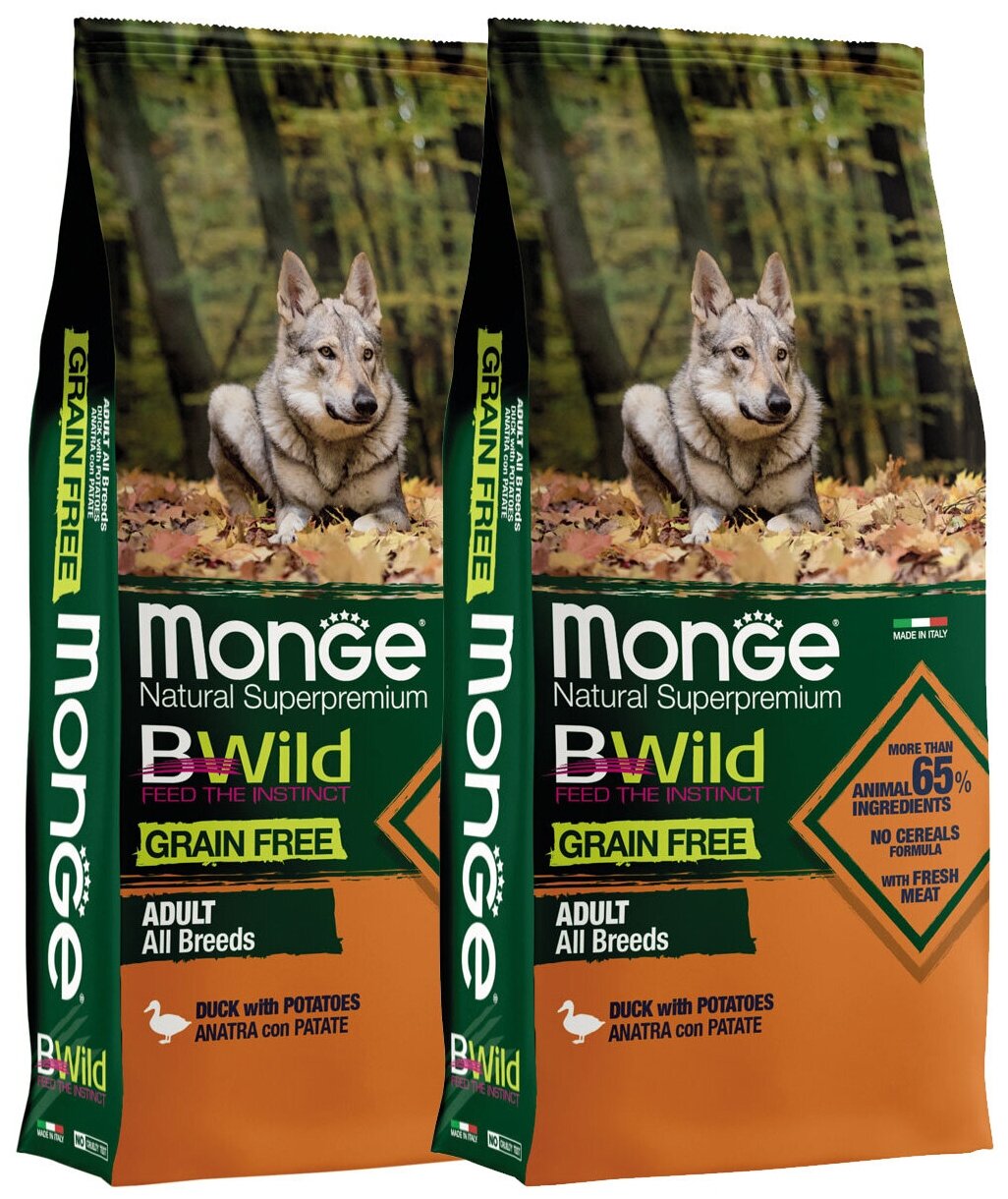 Купить MONGE BWILD GRAIN FREE DOG ADULT ALL BREEDS DUCK беззерновой для взрослых собак всех пород с уткой и картофелем (12 + 12 кг)