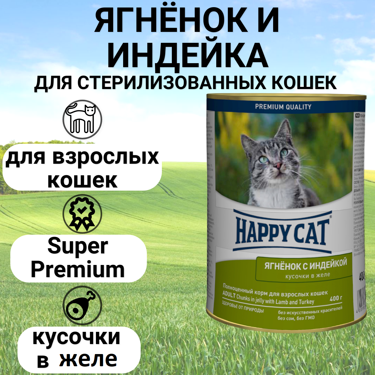 Happy Cat Хэппи Кэт Консервы для Кошек Ягненок и Индейка Кусочки в Желе 12х400гр