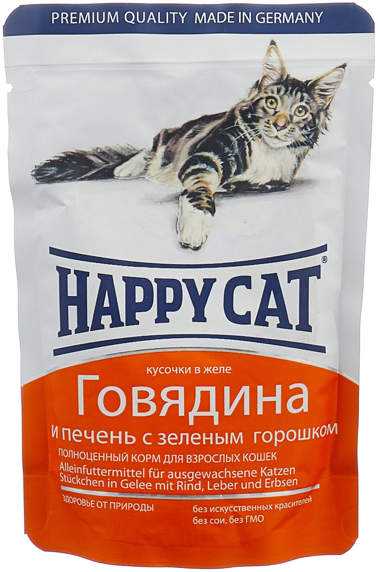 Happy Cat влажный корм для взрослых кошек с говядиной, печенью и горохом в желе, в паучах - 100 г
