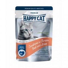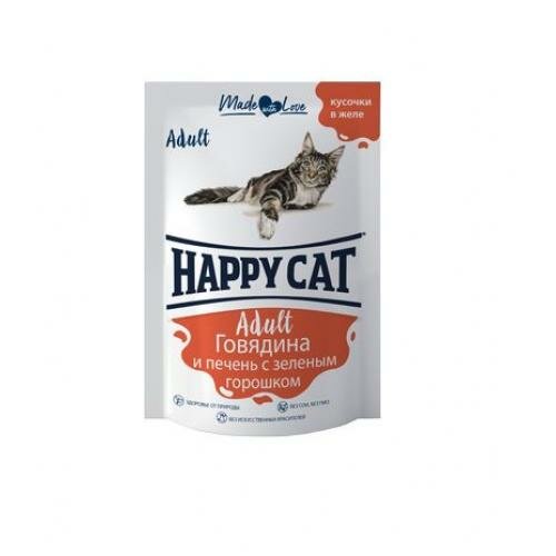 Happy Cat влажный корм для взрослых кошек с говядиной, печенью и горохом в желе, в паучах - 100 г