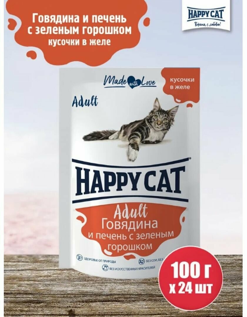 Влажный корм для кошек Happy Cat с говядиной, с печенью, с горошком 24 шт. х 100 г (кусочки в желе)