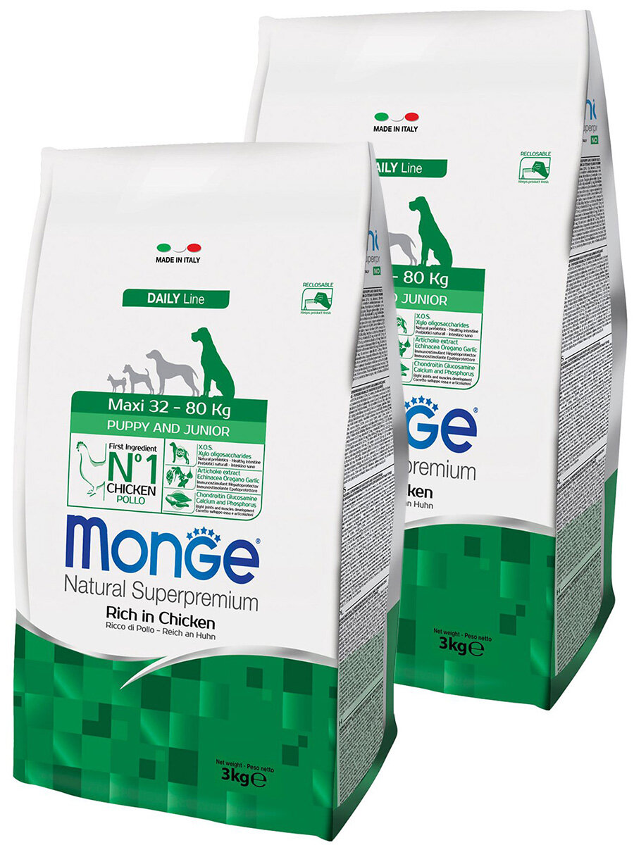 Купить Сухой корм MONGE DOG MAXI PUPPY & JUNIOR CHICKEN для щенков крупных пород с курицей (3 + 3 кг)