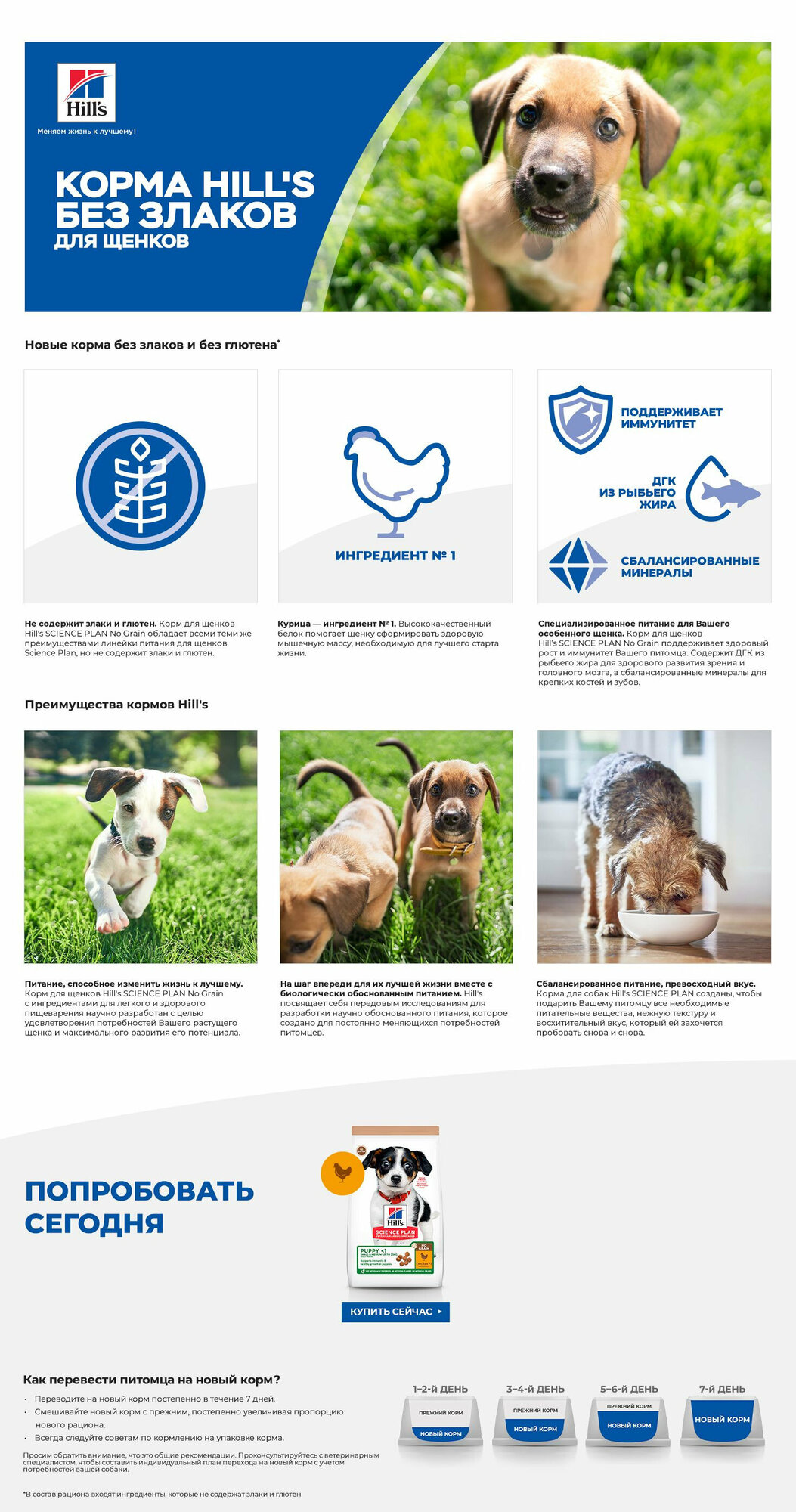 Hill's Science Plan Hill's Science Plan No Grain корм для щенков, с курицей - полноценный рацион для щенков мелких и средних пород в возрасте до 12 месяцев и для беременных или кормящих собак. 2.5кг