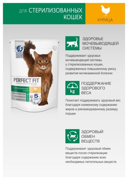 Perfect fit Набор кормов для стерилизованных кошек, c курицей (сухой корм 2,5кг и паучи 7шт*75г) 3.025 кг интересное: