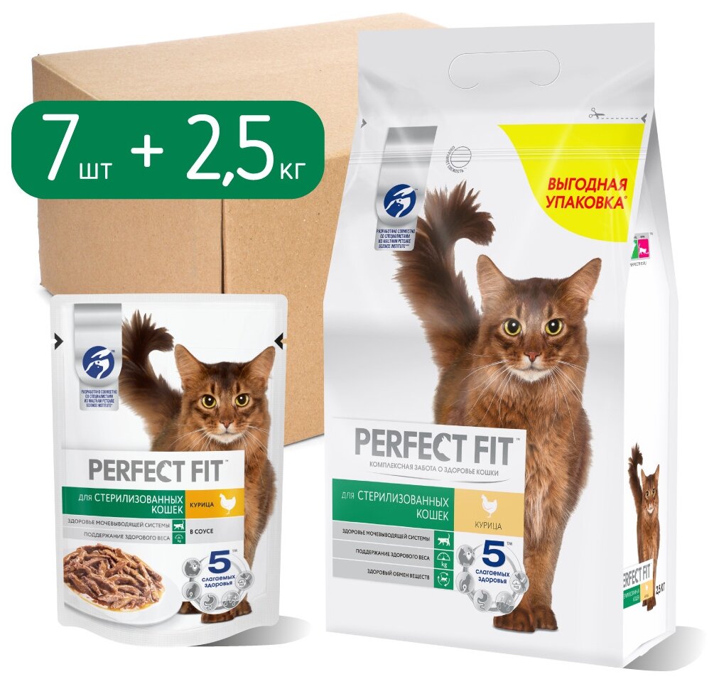 Купить Perfect fit Набор кормов для стерилизованных кошек, c курицей (сухой корм 2,5кг и паучи 7шт*75г) 3.025 кг