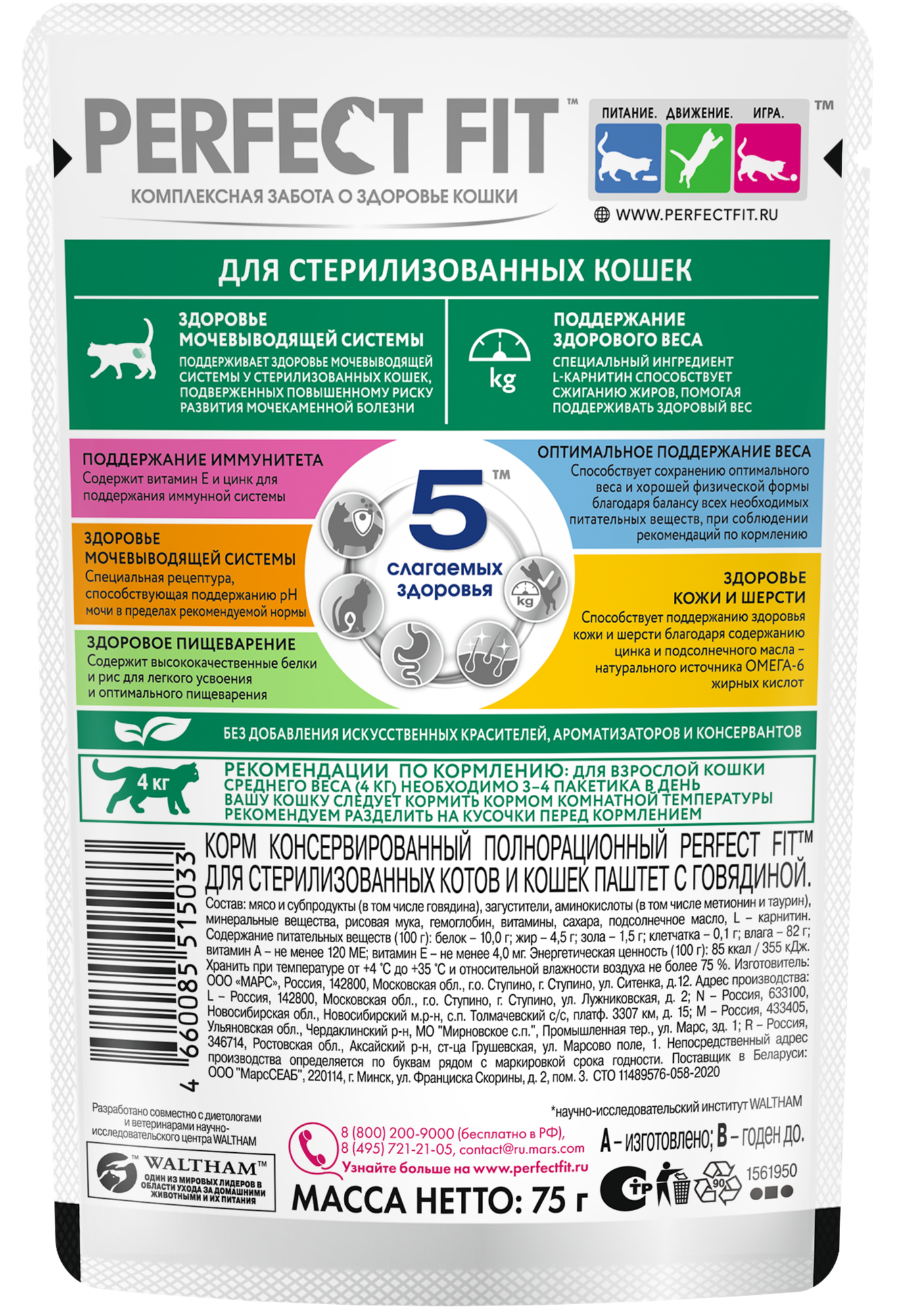 10245093/10237367 PERFECT FIT Пауч паштет кастрированные коты/стерилизованные кошки Говядина 75гр