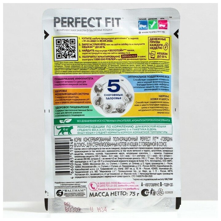 Купить Корм для кошек PERFECT FIT Sterile для стерилизованных, говядина в соусе пауч 75г (упаковка - 28 шт)