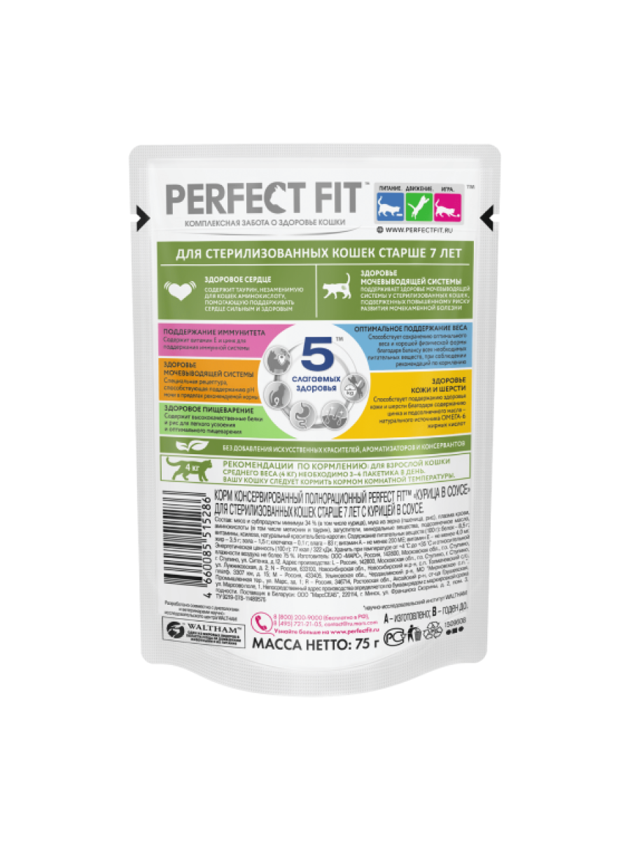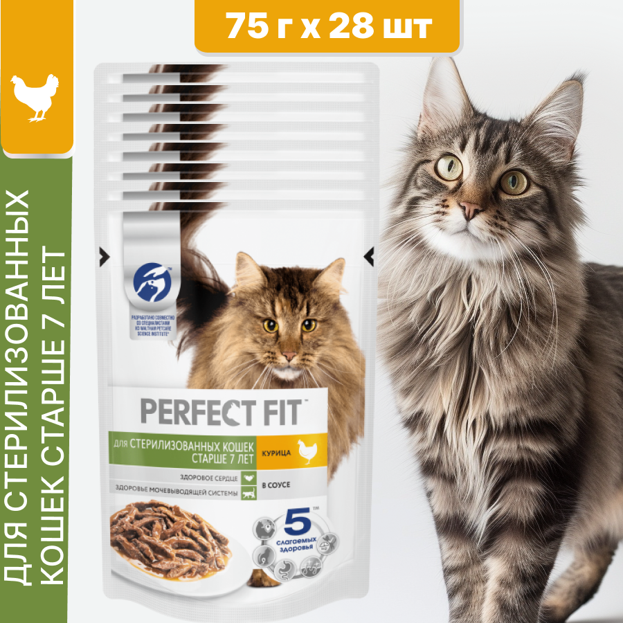 Купить PERFECT FIT для пожилых кастрированных котов и стерилизованных кошек старше 7 лет с курицей в соусе (75 гр х 28 шт)