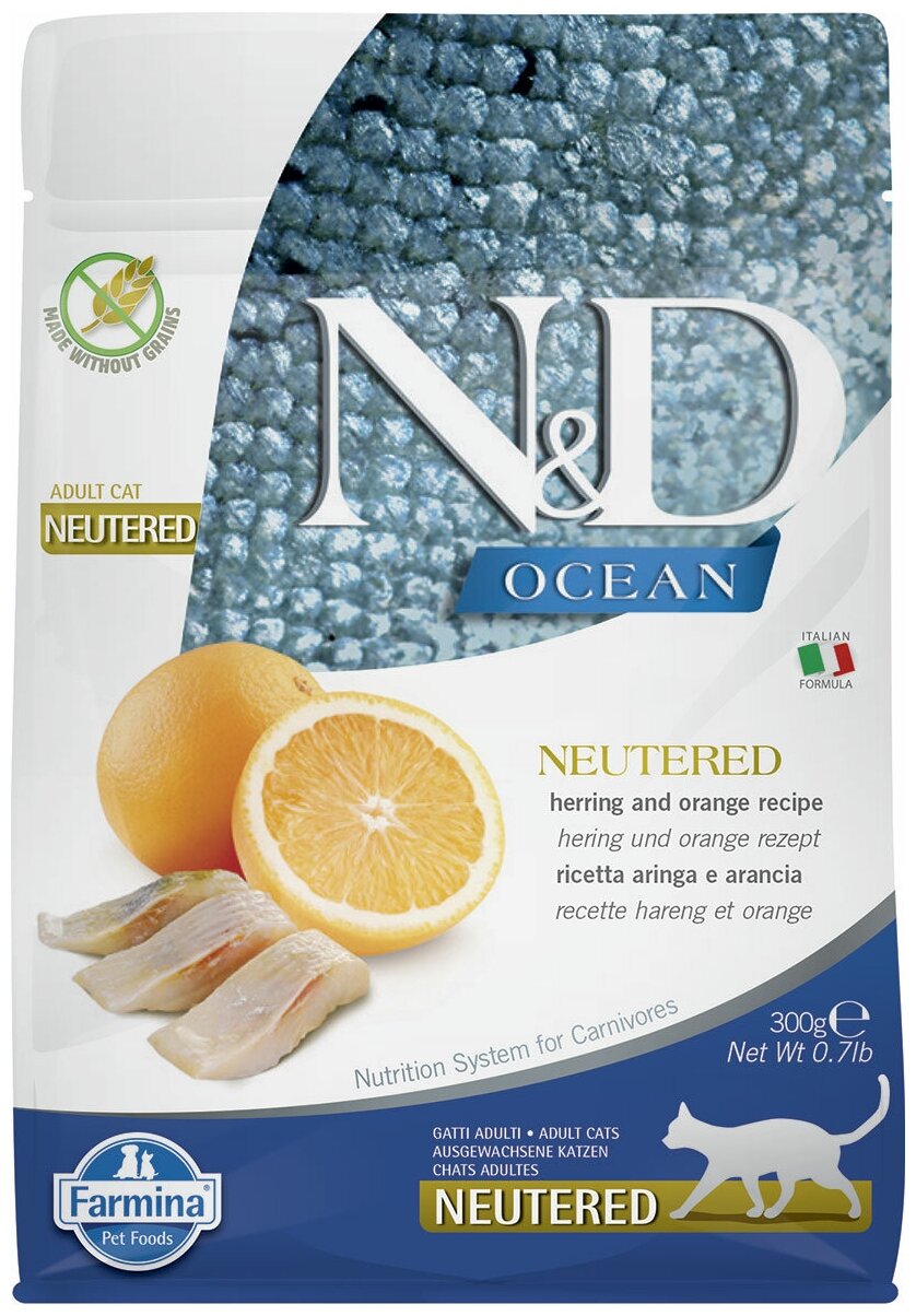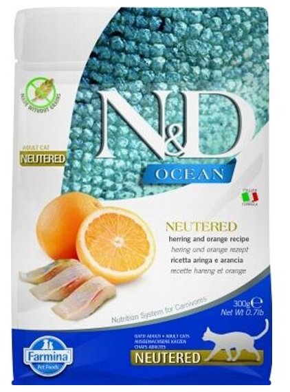 FARMINA CAT N&D OCEAN NEUTERED HERRING & ORANGE беззерновой для взрослых кастрированных котов и стерилизованных кошек с сельдью и апельсином (0,3 кг)
