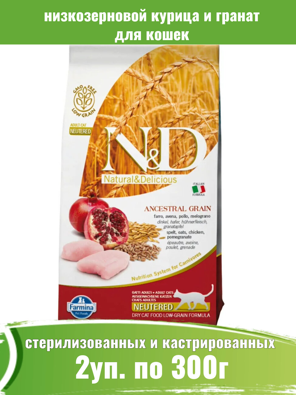 Сухой корм Farmina N&D Ancestral Grain для стерелизованных кошек и кастрированных котов всех пород, Фармина НД низкозерновой рацион со вкусом курицы, граната и овса, 2шт по 300г