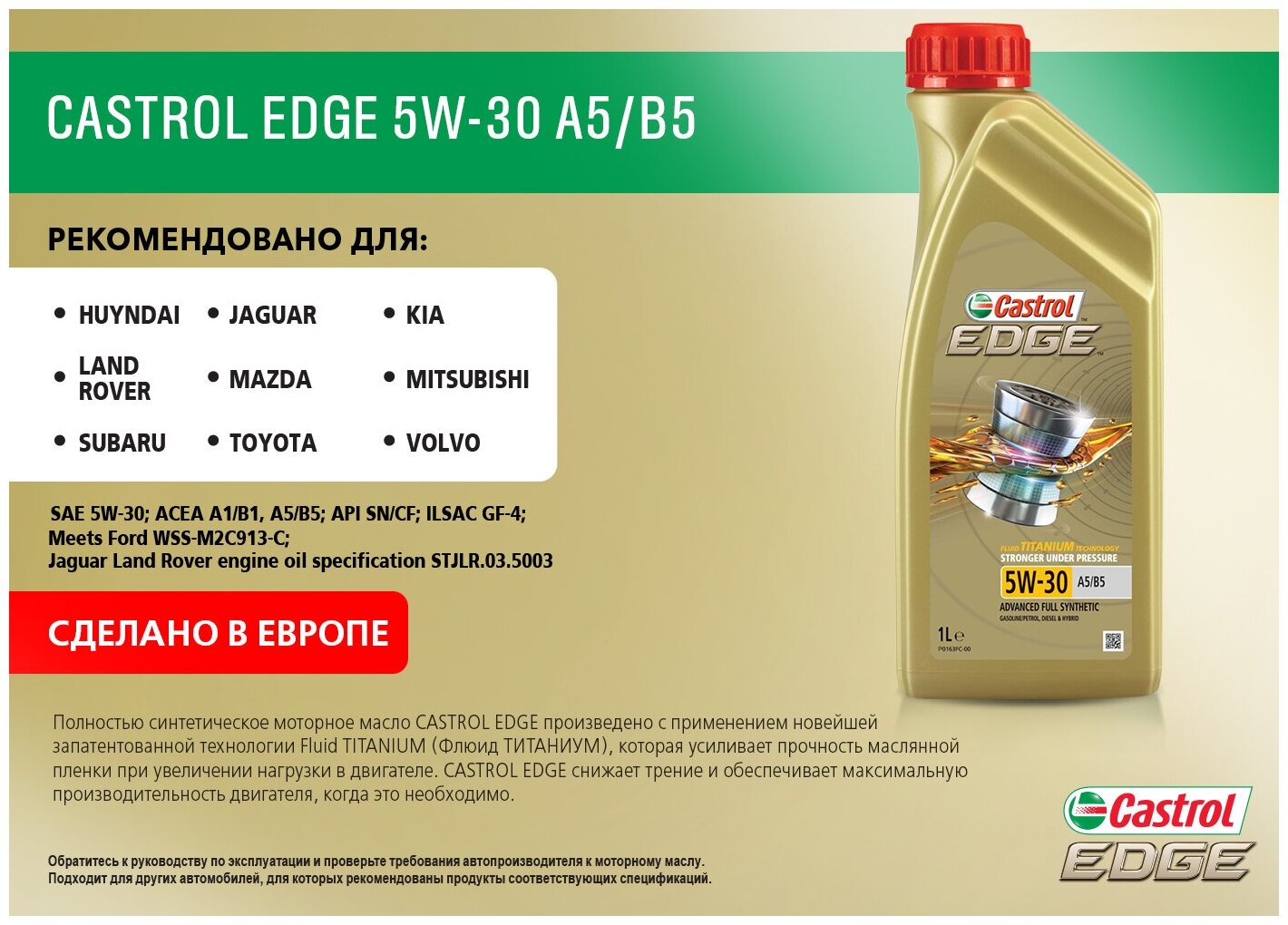 Castrol Castrol^15beb8 Масло Edge 5w-30 A5/B5 1л Sn/Cf Gf-4 Ford Wss-M2c913-C Jaguar Land Rover Stjlr.03.5003