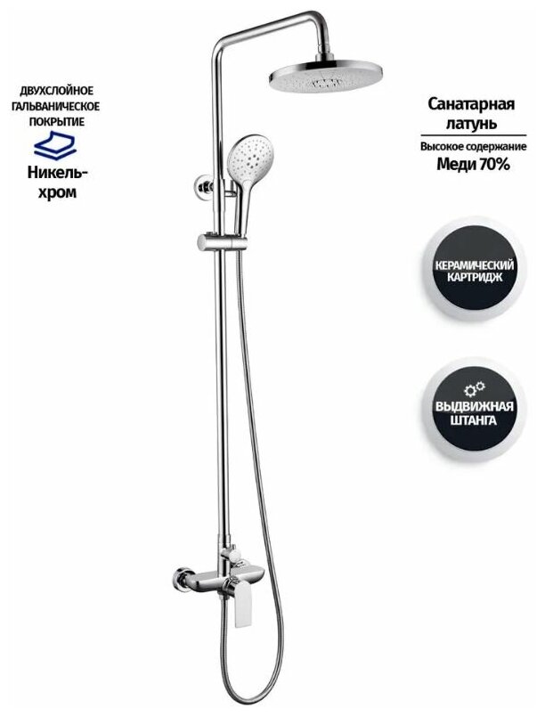 | Комплектация | ручной душ / лейка / верхний душ / вентиль / шланг / кронштейн / держатель лейки |