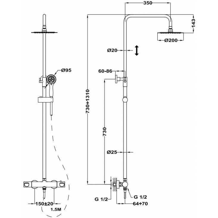 | Дополнительная информация | высота стойки для душа: 1310 мм; диаметр душевой лейки: 95 мм; диаметр верхнего душа: 200 мм |