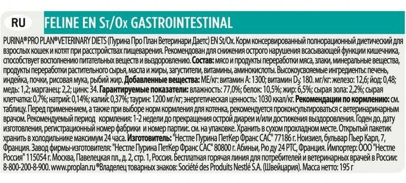 Влажный корм для кошек диетический PRO PLAN® VETERINARY DIETS EN St/Ox Gastrointestinal при расстройствах пищеварения, паштет, 195 г