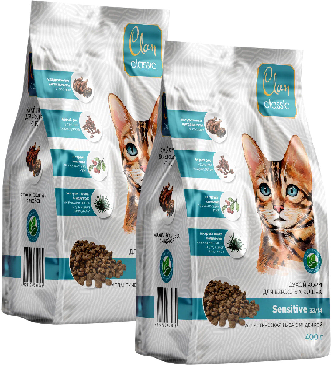 Купить CLAN CLASSIC SENSITIVE 33/14 для взрослых кошек с чувствительным пищеварением с атлантической рыбой и индейкой (0,4 + 0,4 кг)