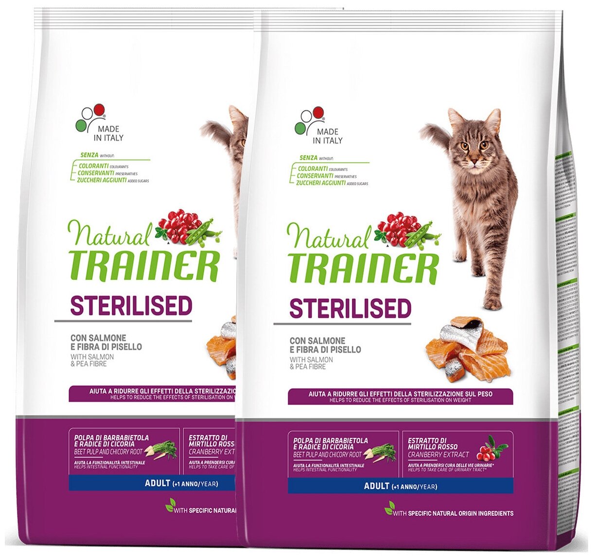 TRAINER NATURAL ADULT CAT STERILISED для взрослых кастрированных котов и стерилизованных кошек с лососем и клетчаткой гороха (10 + 10 кг) интересное: