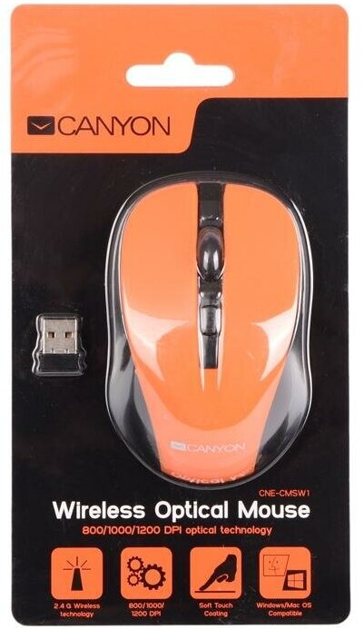 Беспроводная мышь Canyon MW-1, 800/1000/1200DPI, 3 кнопки+колесо прокрутки, оранжевый