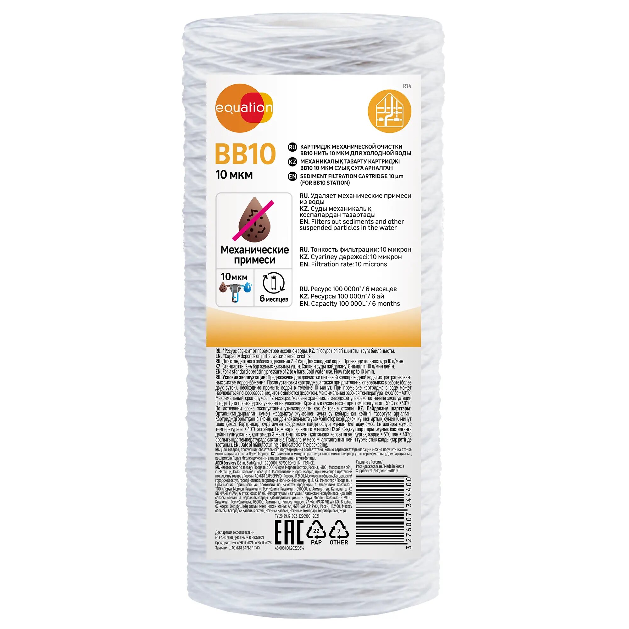 Картридж механической очистки Equation BB10 для холодной воды нить 10мкм интересное:
