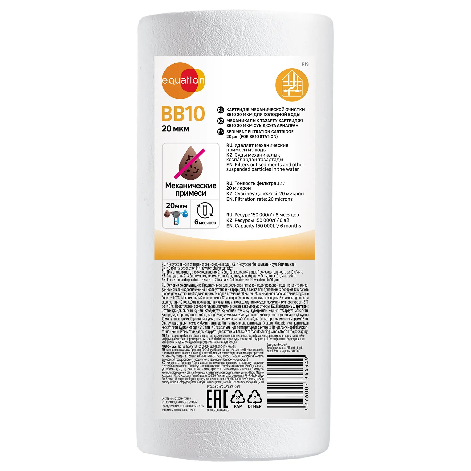 | Дополнительная информация | Картридж механической очистки Equation BB10 для холодной воды |