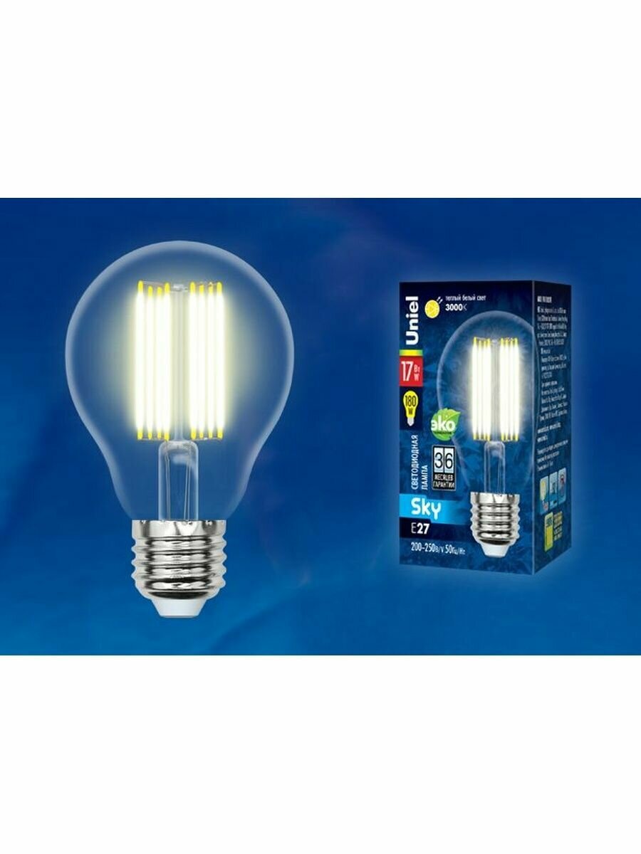 Купить Лампа светодиодная филаментная Uniel E27 17W 3000K прозрачная LED-A70-17W/3000K/E27/CL PLS02WH UL-00004870