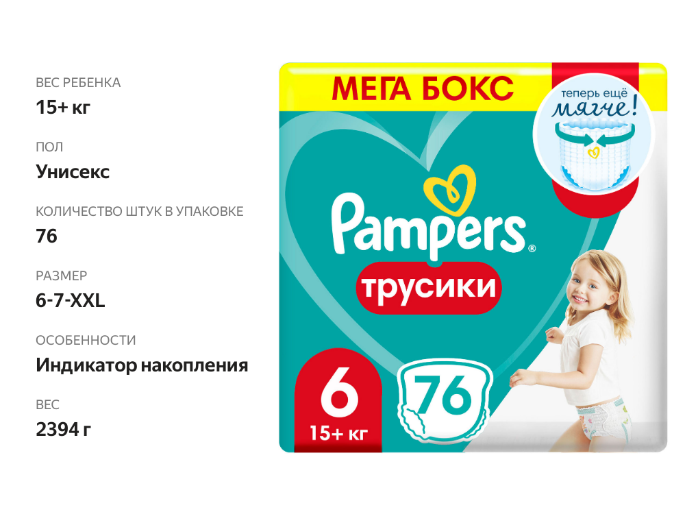 Подгузники-трусики для малышей Pampers от 15 кг, 6 размер, 76 шт (81773344)