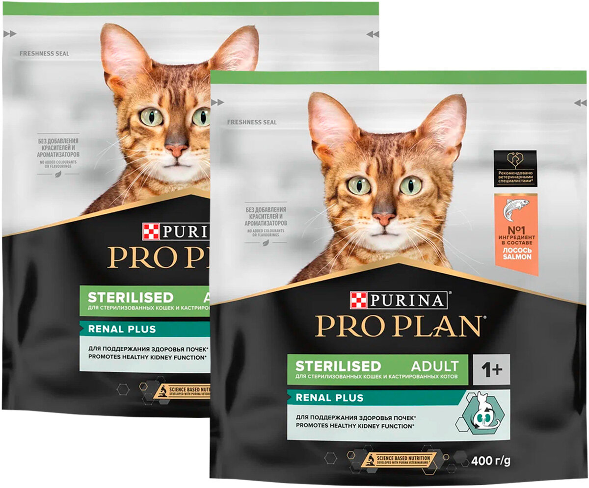 Купить PRO PLAN CAT OPTIRENAL STERILISED SALMON для взрослых кастрированных котов и стерилизованных кошек с лососем (0,4 + 0,4 кг)