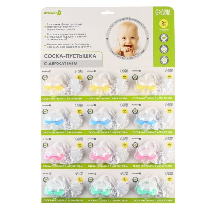 Пустышка ортодонтическая, с держателем, +0мес., на блистере, цвет микс (комплект из 12 шт)