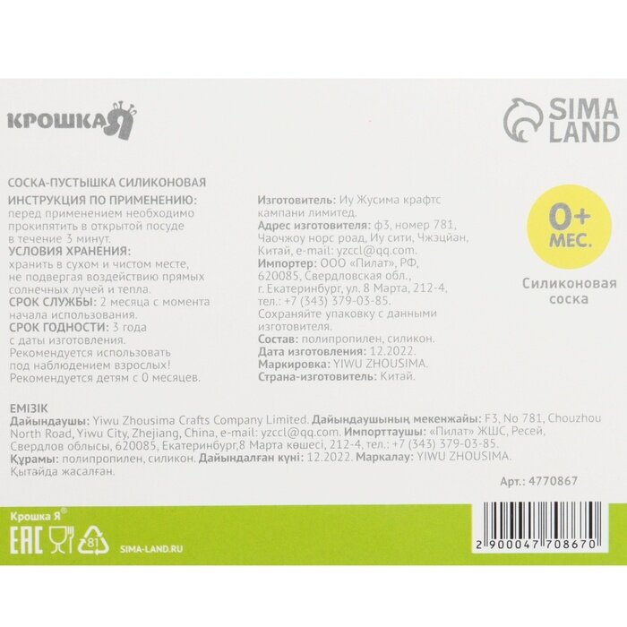 Пустышки Крошка Я Пустышка ортодонтическая, с держателем, +0мес., на блистере, цвет микс