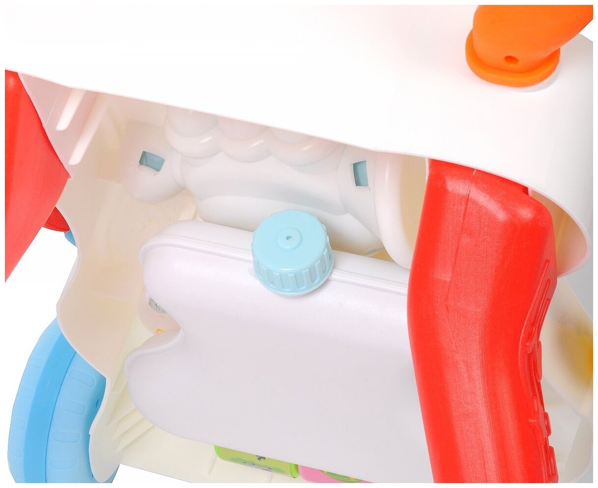 | Дополнительная информация | игровая панель с шестеренками, съёмным металлофоном, игровыми элементами, роликом с картинками, зеркалом, съёмной музыкальной трубой; песни на русском языке, три загадки, две потешки; регулировка скорости колёс; безопасное мягкое покрытие колёс; устойчивая конструкция за счёт контейнера для заполнения водой/песком. |