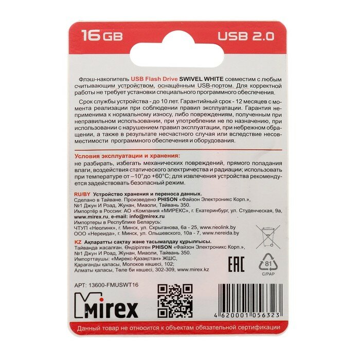 Купить Флешка Mirex SWIVEL WHITE, 16 Гб, USB2.0, чт до 25 Мб/с, зап до 15 Мб/с, белая