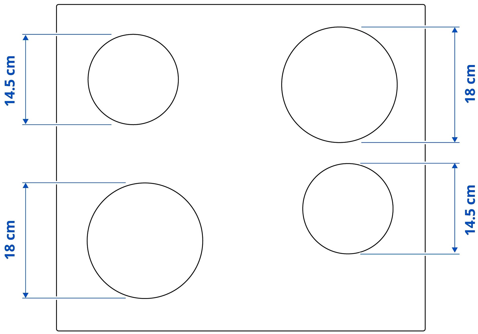 | Размеры конфорок | правая передняя: 14,5 см; левая передняя: 18 см; левая задняя: 14,5 см; правая задняя: 18 см |