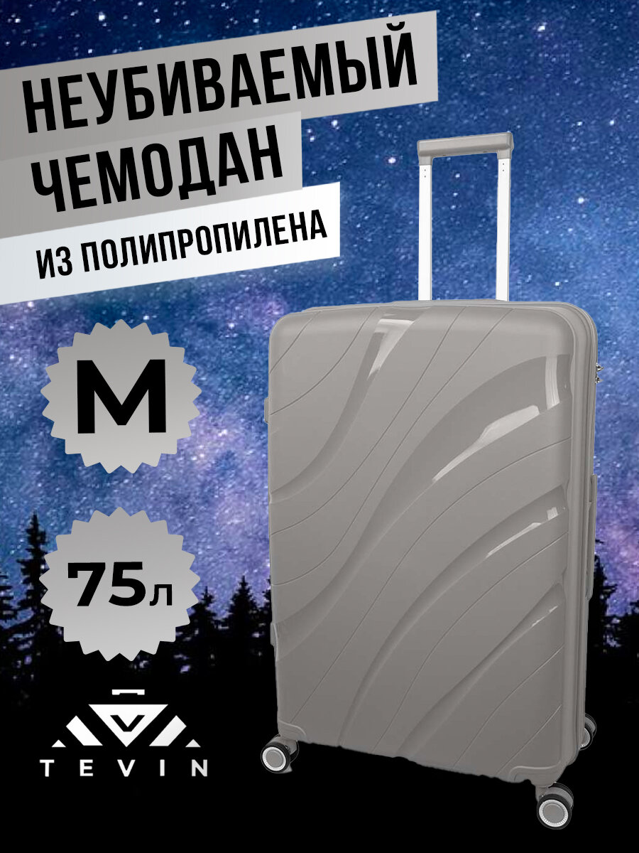 Купить Чемодан на колесах дорожный средний багаж для путешествий мужской m TEVIN размер М 64 см 62 л легкий 3.2 кг прочный полипропилен Серый светлый