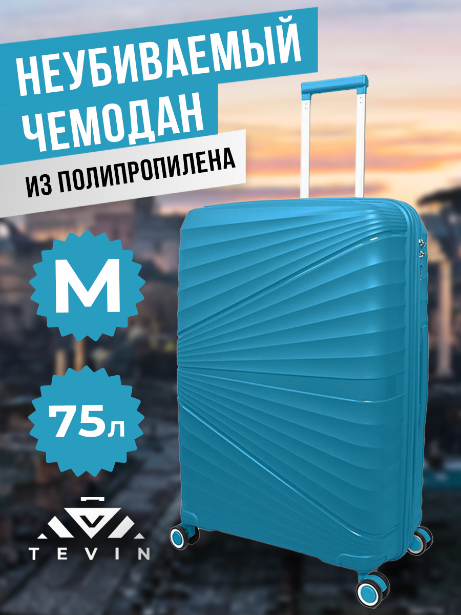 Чемодан на колесах дорожный средний багаж для путешествий мужской m TEVIN размер М 64 см 62 л легкий 3.2 кг прочный полипропилен Черная волна