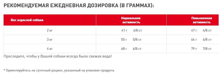 | Дозировка | см. таблицу. Корм готов к употреблению. Проследите, чтобы у вашей собаки всегда была свежая вода |