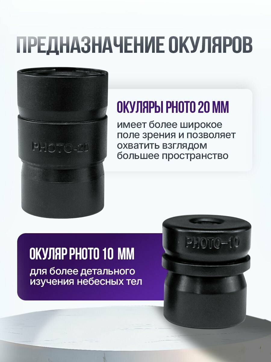 Эта модель комплектуется двумя окулярами. Начинать наблюдения лучше с окуляра с фокусным расстоянием 25 мм. Он имеет более широкое поле зрения и позволяет охватить взглядом большее пространство. Для более детального изучения небесных тел следует использовать окуляр с фокусным расстоянием 10 мм. |