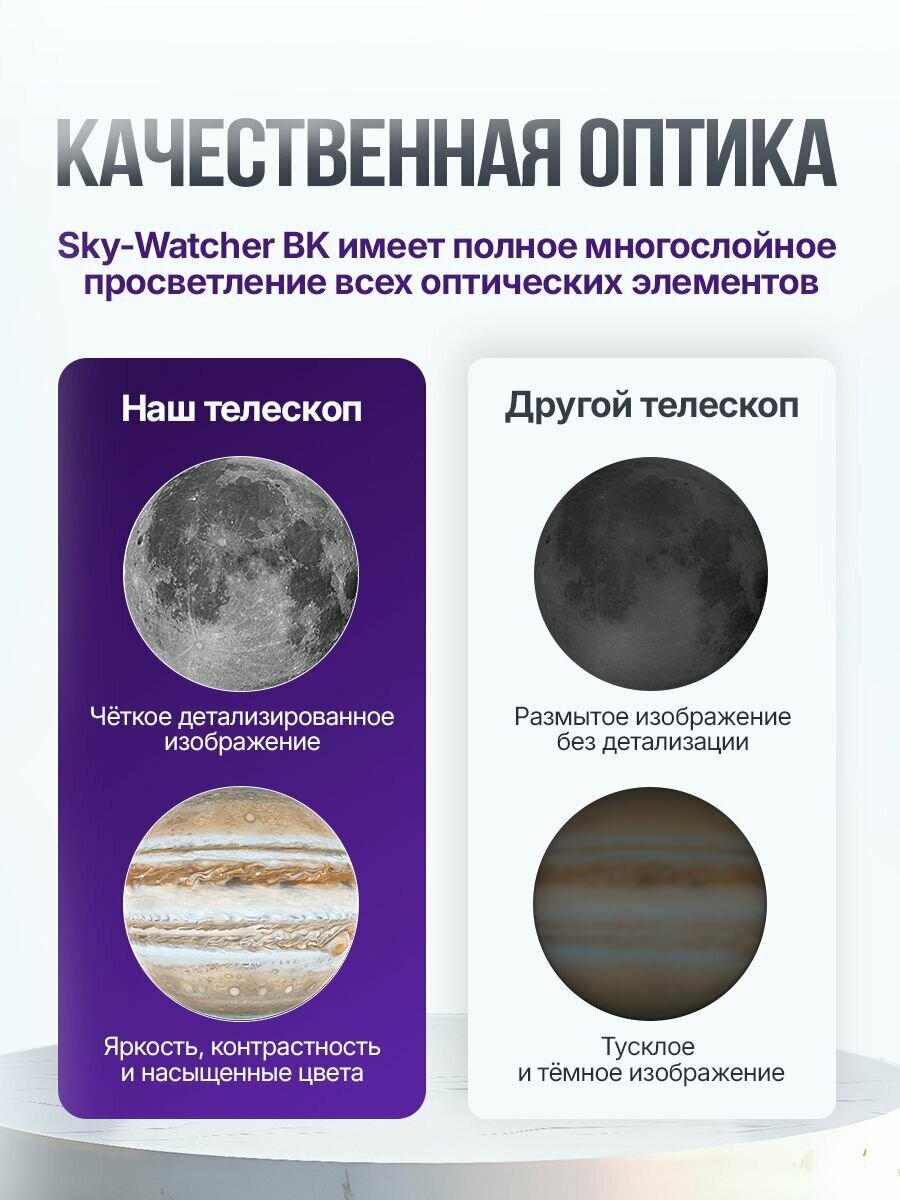 | Минусы: | Комплектация. 2 окуляра маловато, пришлось докупать аксессуары, в т.ч. фильтры. Но, если бы в комплектации было бы много элементов, то они скорее всего были бы низкого качества или сама труба была бы с пониженными характеристиками. |