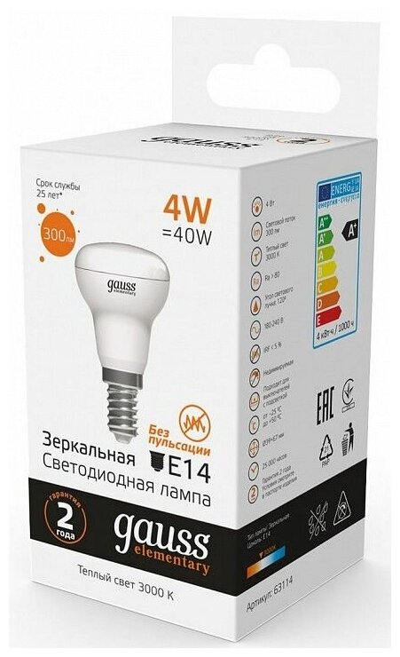 Лампа Gauss Elementary R39 4W 300lm 3000K E14 LED 1/10/50 63114