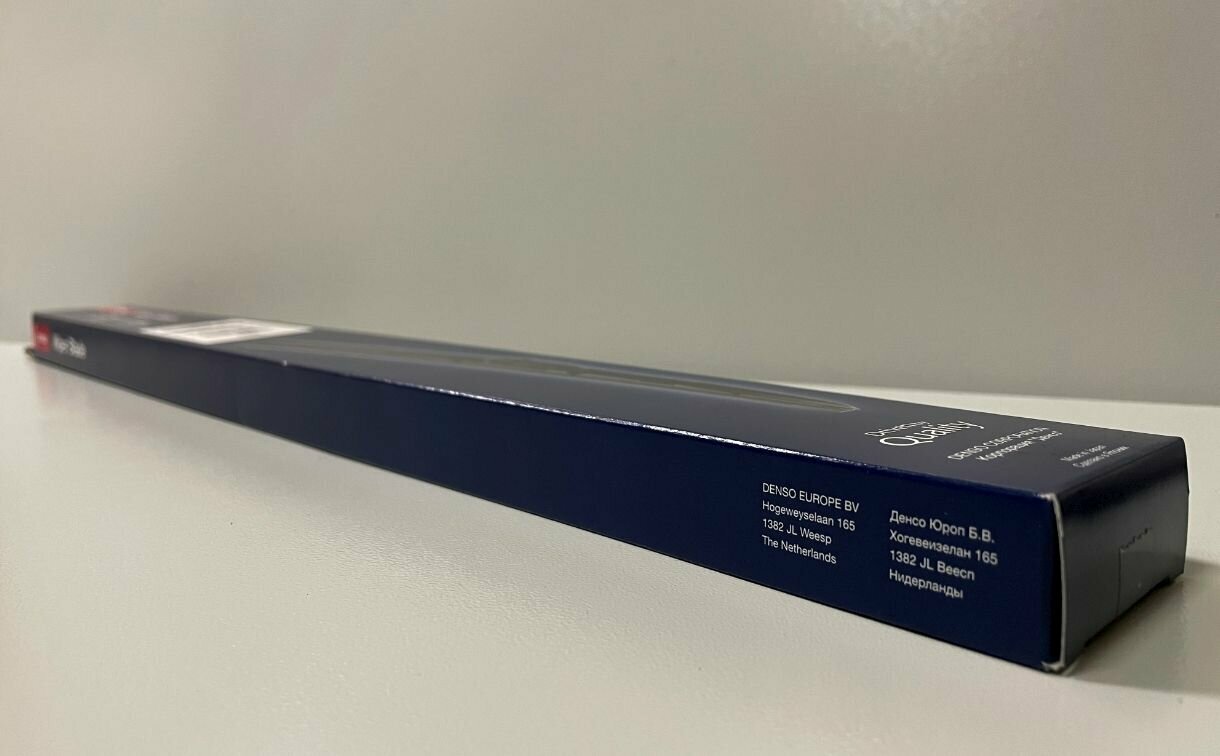 На фото показаны основные признаки, по которым идентифицируется оригинал: - фиксирующая резинку металлическая полоса серебристого цвета, а не черная; - маркировка на фиксаторе четкая и полная; - на резинке маркировка NWB; - на крючке-защелке маркировка; - на резинке маркировка с указанием длины резинки (в данном случае должно быть 550 мм); - полный комплект (с доп. фиксатором щетки); - дополнительный картонный каркас для щетки. Денсо пакует продукцию дочерней компании NWB в свою брендовую упаковку. |