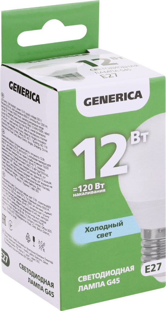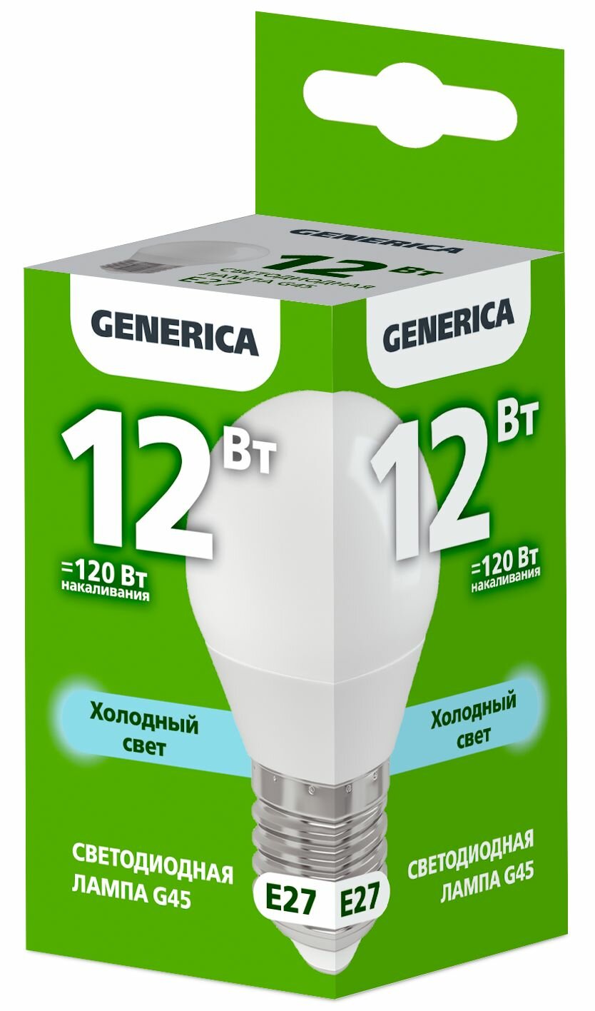 GENERICA Лампа светодиодная GENERICA G45, 12 Вт, шар, 6500 К, E27 230 В, LL-G45-12-230-65-E27-G