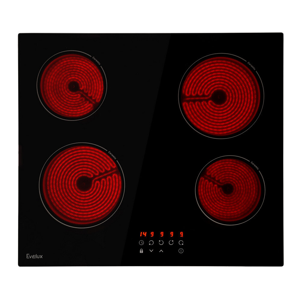 Варочная панель EVELUX электрическая, стеклокерамика, Hi Light, 60 см, 4 конфорки, сенсорное управление, 9 уровней мощности, таймер 1-99 мин, блокировка управления, защитное отключение, 6000 Вт, черное стекло, 590х520х50 мм.