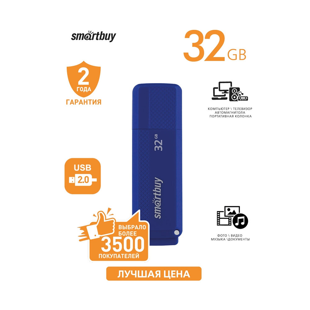 Флешка Smartbuy 32GBDK-B, 32 Гб, USB2.0, чт до 25 Мб/с, зап до 15 Мб/с, синяя
