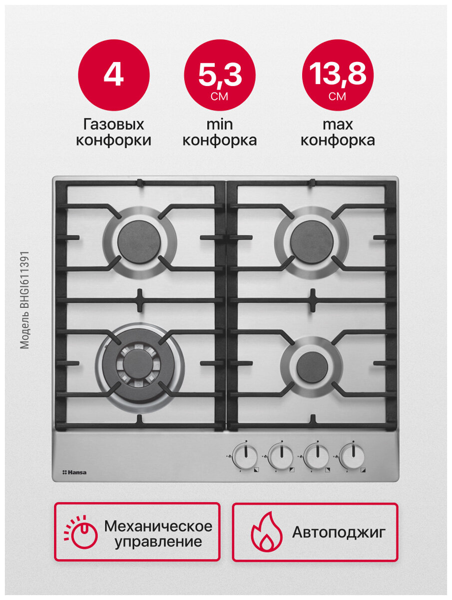 Газовая варочная панель Hansa BHGI611391, встраиваемая, 60 см, газ-контроль и автоподжиг, конфорка повышенной мощности, чугунные решетки, нержавеющая сталь