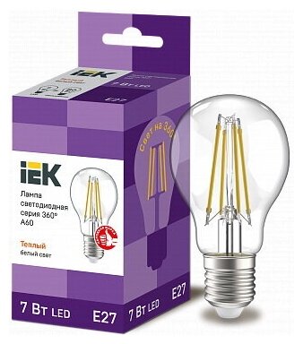 Лампа светодиодная филаментная 360° 7Вт A60 грушевидная прозрачная 3000К тепл. бел. E27 230В IEK LLF-A60-7-230-30-E27-CL