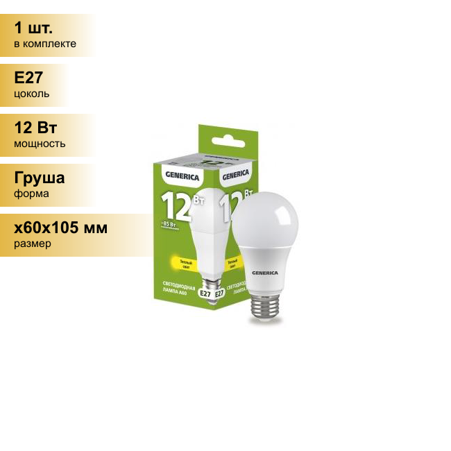 Лампочка светодиодная E27, A60 груша, 12Вт 230В 3000К GENERICA
