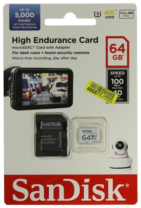 Карта памяти microSDXC SanDisk High Endurance - 64 Гб - высокой прочности для камер 4К UHD - 5К часов + адаптер