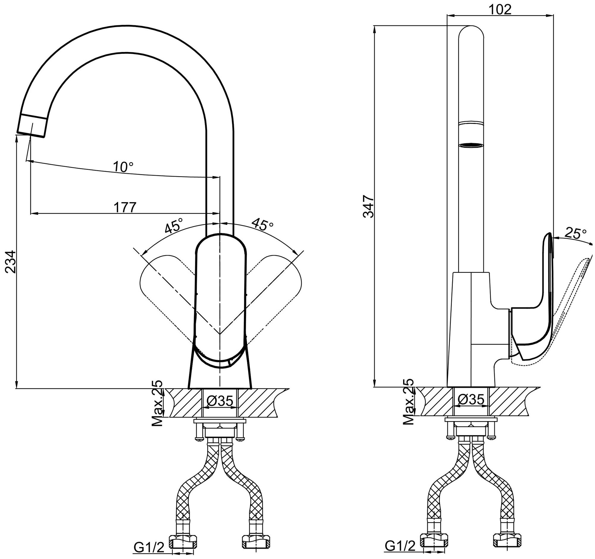 | Угол поворота рукоятки гориз. | 25 градусов |