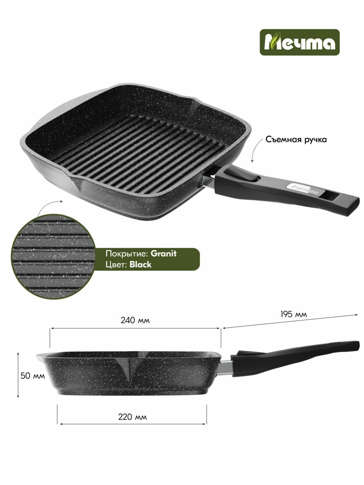 Купить Сковорода-гриль квадр. "Мечта" 24*24см Гранит с антипригарным покрытием со съемной ручкой и крышкой, можно мыть в посудомоечной машине